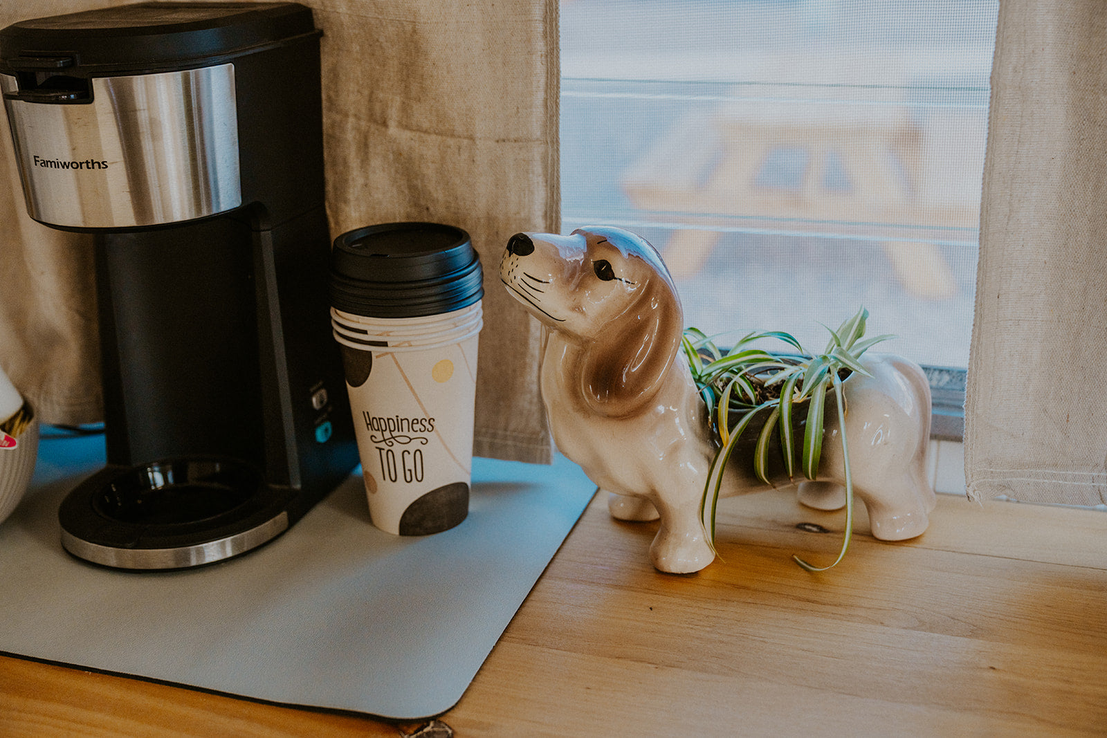 Each trailer features a microwave, mini fridge, K-Cup coffee maker with pods, and a Brita water pitcher for your convenience.